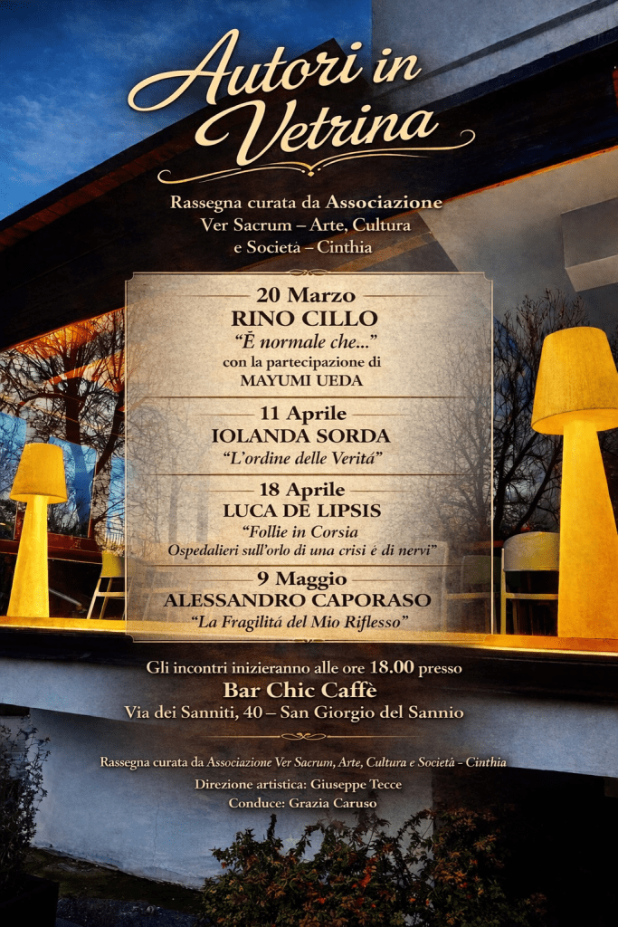 In attesa della quarta edizione di “Letture dal Bosco”, che quest’anno (2026) si terrà il 19 di Luglio (terza domenica di Luglio) a Lago Laceno come di consueto, teniamo alta l’attenzione dei lettori e degli scrittori, nonchè di tutti gli amici che ci seguono, con “Letture dal Bosco” tutto l’anno. Abbiamo organizzato una rassegna libraria molto bella, che si svolgerà a San Giorgio del Sannio, presso il Bar Chic Caffè, in via dei Sanniti 40. Avremo con noi ben cinque autori, molto bravi e motivati a presentare i loro lavori. Alleghiamo la locandina degli eventi. Partecipare è grautuito, è un momento di condivisione e un modo per stare insieme con un buon bicchiere di vino e un bellissimo racconto, fatto direttamente dall’autore.