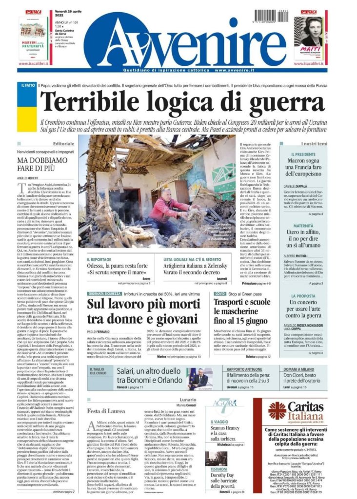 Sono passati 65 interminabili giorni da quando questa ennesima guerra, una guerra nel cuore della civile Europa, ha avuto inizio, con immagini disumane di massacri e distruzione. Tutti noi vogliamo la pace, tutti noi vogliamo fortemente fermare il massacro, non giustificato e non giustificabile, che è in atto. Ma è sul come che si determinano le divergenze. Si, lo ammetto, sono un intervenrista: se hai un cancro non c’è altra soluzione se non l’asportazione, poi si passa alla fase della cura. Non ho mai visto un cancro regredire per il solo fatto che gli sia stato ordinato di farlo, ne con le buone, ne con le cattive parole. I pacifisti, hanno le loro ragioni, che non condivido, ma che comprendo. Oggi c’è un editoriale su Avvenire, dell’amico Angelo Moretti, che fa, finalmente, delle proposte concrete al movimento pacifista. Lo ringrazio, perché, per la prima volta, si è avuta la capacità di mettere da parte gli slogan facili sul fermate le armi e frasi similari, per concretizzare proposte operative da mettere in campo. È un vero salto di qualità nella variegata discussione aperta nel fronte pacifista. Passare dalla passività degli slogan alla operatività sul campo, potrebbe davvero segnare il passo in questa situazione che sembra senza via d’uscita.