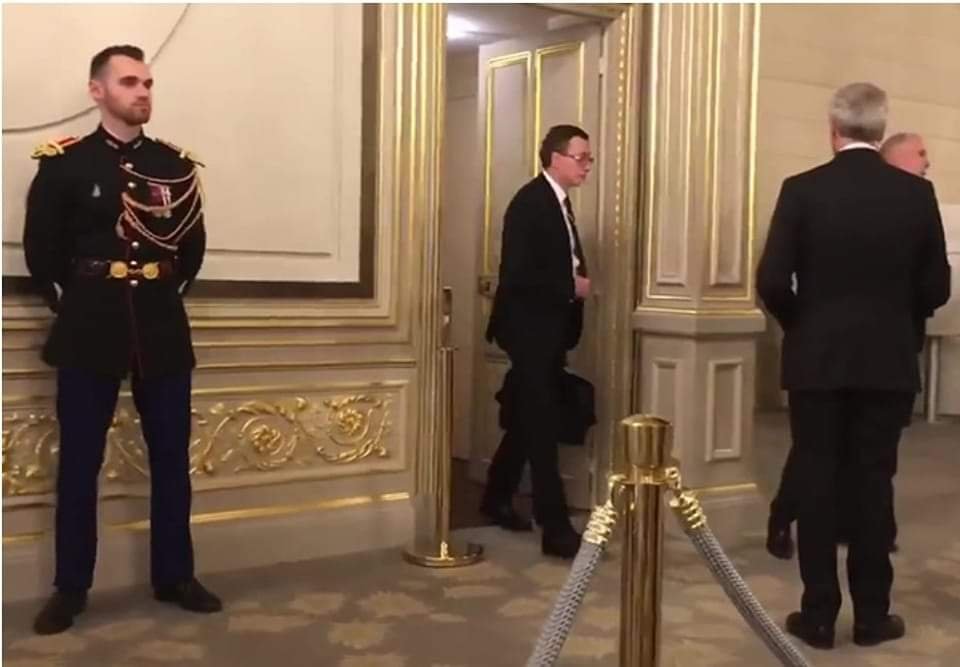 Foto: un ufficiale del FSO porta fuori una borsa dalla toilette dove si trova Putin durante il vertice del quartetto di Normandia a Parigi il 9 dicembre 2019.