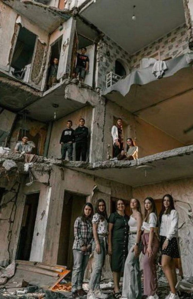 I diplomati di una delle scuole superiori ucraine di Chernihiv tornano nella scuola per un servizio fotografico da pubblicare sull’annuario.