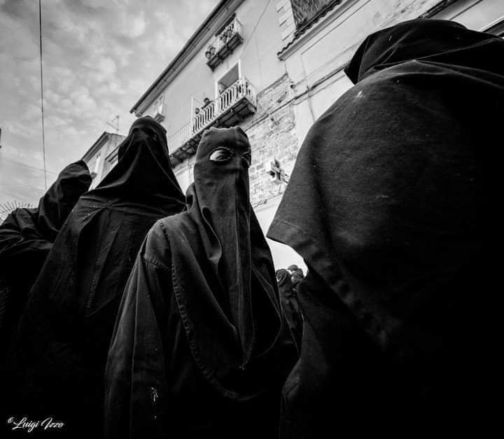 il nero dei penitenti, confratelli incappucciati; delle donne velate, molte persino scalze in processione;