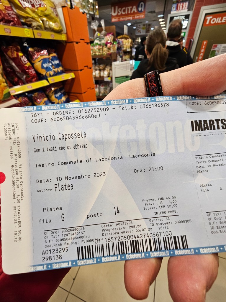 1) un mese fa mi compro il biglietto per il concerto di VINICIO CAPOSSELA a Lacedonia. Costo 50 euro.