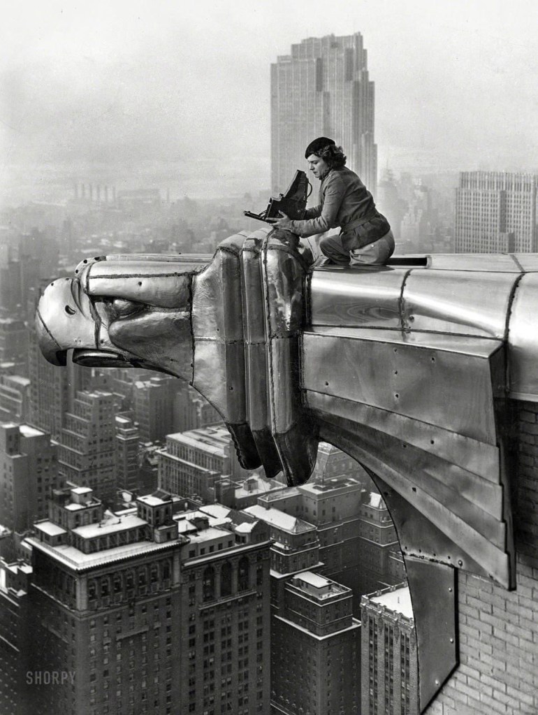 1934, #NewYork, #USA, 61° piano del Chrysler Building: la fotografa Margaret Bourke-White scatta una foto su un’aquila iridea come punto di osservazione.