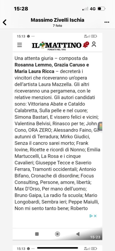 Sono nell’elenco dei finalisti al premio letterario “Approdi D’Autore” che si concluderà il 6 Luglio nella Piazza del Soccorso di Forio d’Ischia.