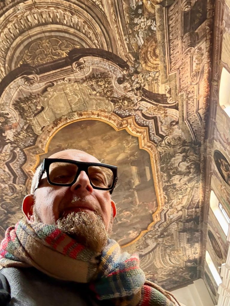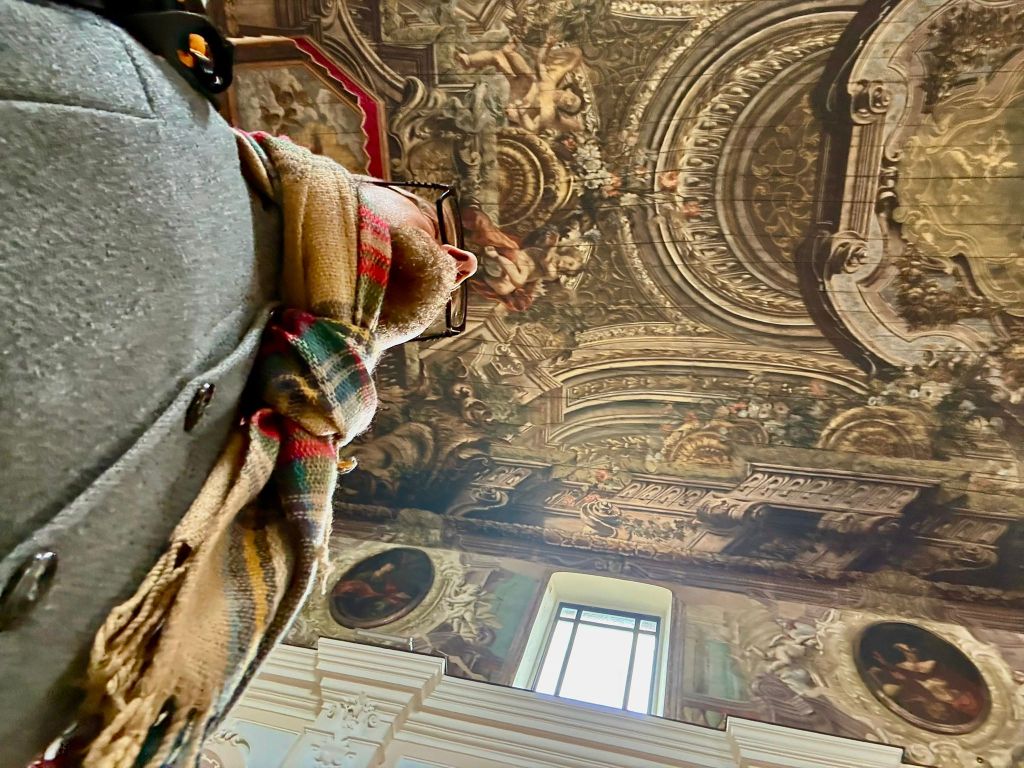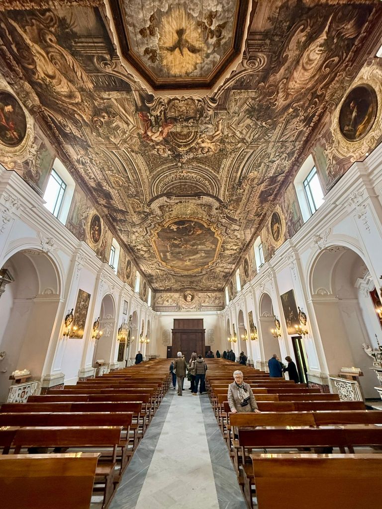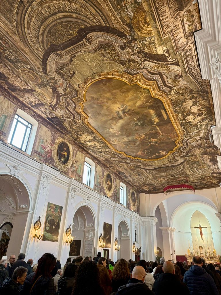 Arrivato in paese un po’ in ritardo sul programma di marcia che mi ero prefissato, mi fiondo subito nel centro storico. Parcheggio la dove Via della Rinascita si allarga in una curva, formando uno slargo, delimitato da una ringhiera, che si affaccia sulla bella valle sottostante. Percorro con passo frettoloso Vico Santo Spirito, che è in salita, e anche piuttosto ripida, tuffandomi, infine, su via Eclano, la via che in pratica divide in due, di lungo, tutto il centro storico della bella cittadina. Lungo la via è un continuo susseguirsi di palazzi settecenteschi ed ottocenteschi, con facciate imponenti e graziose decorazioni. Arrivo con un po’ di affanno alla maestosa Chiesa Madre di Santa Maria Maggiore. Il grande portone è aperto, e finalmente riesco ad entrare. La chiesa è gremita fino all’estremo. Non solo sono occupati tutti i posti a sedere, ma molte persone sono in piedi, accalcate nelle retrovie. Entro, facendomi largo con un po’ di fatica. Il freddo, che stranamente, oggi ancora pervade l’aria, che della primavera non ne vuole proprio sapere, costringe tutti a tenere ancora addosso i cappotti invernali. Dai comignoli delle case circostanti si spande l’odore acre e piacevole della legna che arde, che arriva fin dentro la Chiesa. Tutti ascoltano l’omelia con profonda attenzione. Il Prete, che scoprirò poco dopo essere il Vescovo, pronuncia parole di pace e di speranze e sembra la vera star della giornata. Tutti gli occhi sono puntati su di lui, almeno fino al momento della Comunione, quando un’infinità di persone, cioè quasi tutti i partecipanti alla messa, si accalcano in coda nel corridoio centrale della Chiesa, per ricevere l’Eucarestia. Questo momento, in genere breve e sbrigativo, si prolunga per molto tempo, mentre dalla parte dell’altare si diffonde una musica sublime di un organo e si innalzano canti di voci che sembrano divine. La mia curiosità si infittisce. L’organo ha un suono bellissimo, e le voci sono così perfette che mi viene da pensare che siano registrate. Poi la mia attenzione viene attratta dal soffitto della Chiesa, interamente ricoperto di pannelli in legno, finemente dipinti, in modo da formare un unico, immenso affresco, che ricopre tutta l’unica grande navata. Resto estasiato, sospeso tra i canti, che non avevo mai ascoltato di così belli, e il fascino dell’arte pittorea, che dal soffitto sembra ricadermi addosso.