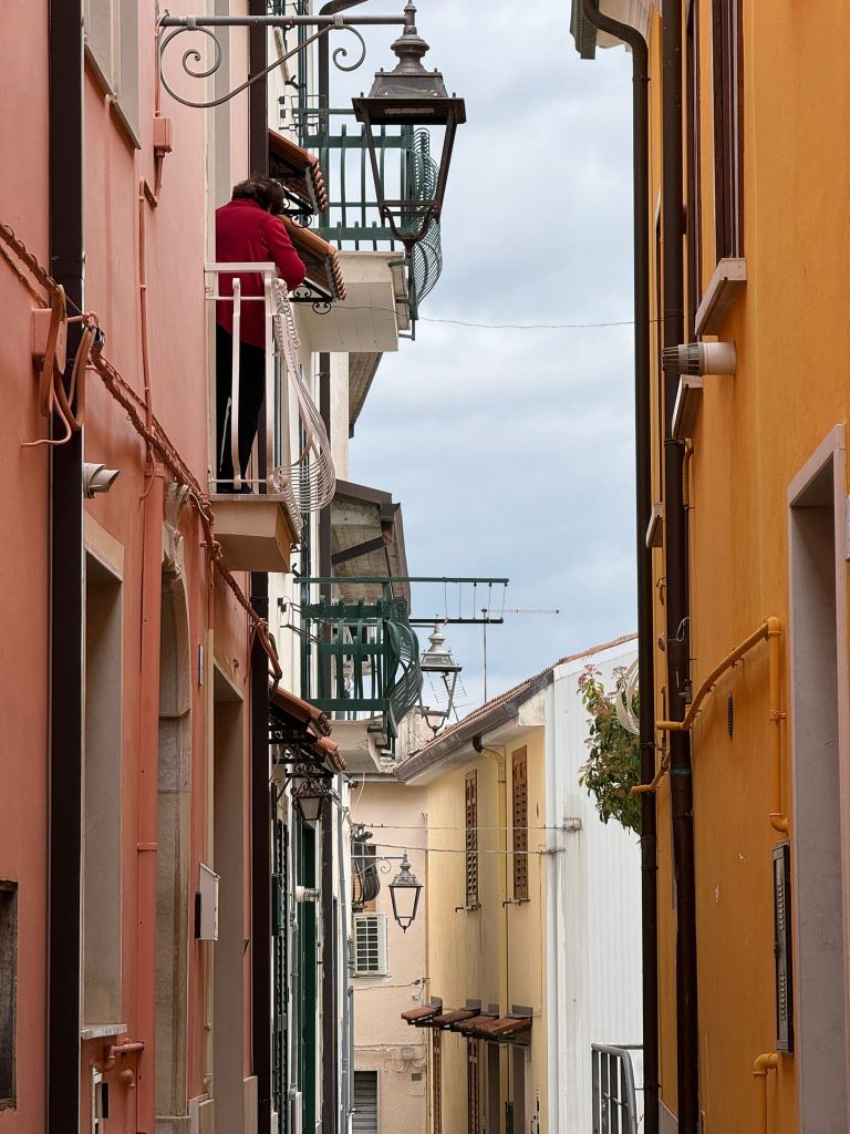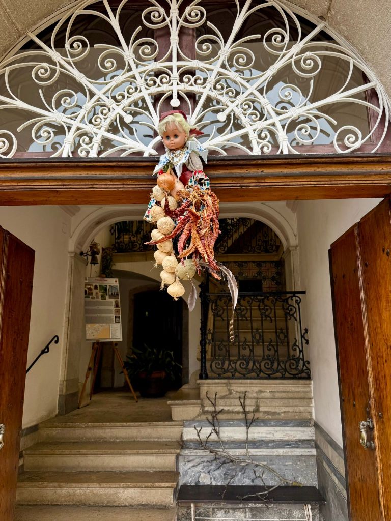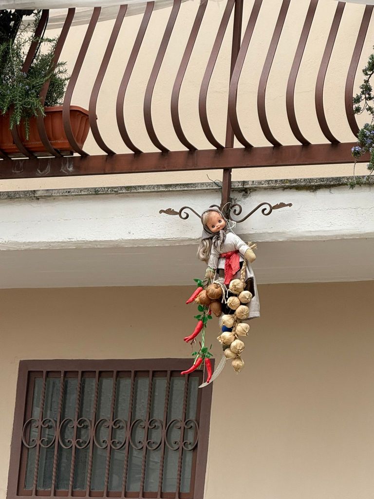 Esco rigenerato nella bella piazzetta antistante, e mi accorgo presto che ad ogni balcone delle case, non solo prospicienti la piazza, ma anche di quelle che corrono lungo il dedalo di vie, ci sono appese delle bambole, intrecciate con dei simboli precisi: il peperoncino, diverse teste d’aglio intrecciate, e in basso un qualcosa che sembra una patata dalla quale spunta una piuma. Camminando per le stradine limitrofe, mi accorgo che ogni balcone, ogni portone, porta appeso questo intreccio di cose, quasi fosse un amuleto. Finalmente incontro un giovane, il quale mi spiega che si tratta di un’antica tradizione di Mirabella, che prevede che questi oggetti scaramantici restino appesi per tutto il periodo della Quaresima e che le piume appese nella parte basse sono tante quante le settimane che dividono la fine del carnevale con la Pasqua. La tradizione vuole, inoltre, che si tolga una piuma per ogni settimana trascorsa, togliendo l’ultima nel giorno di Pasqua. Questo spiega esattamente perché ognuno di questi pendagli abbia una sola ed unica piuma, che spunta verso il basso. Intanto si è fatta l’ora del pranzo. Sono le 13.30. Il brusio delle strade si è azzittito completamente, i comignoli cacciano più fumo, segno che le attività umane si sono spostate all’interno delle case graziose di questi vicoli medievali. Oggi è la Domenica delle Palme e prende inizio, in ogni singola casa, il grande e antico rito del pranzo della domenica di festa, in attesa della grande festività che si celebrerà tra una settimana, il giorno di Pasqua.