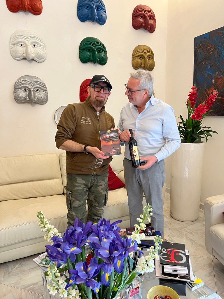Stamattina a Napoli, presso la sede della Graus Edizioni mi è stata consegnata da Pietro Graus la prima copia della mia ultima creatura “Tramonti Occidentali”, mentre io gli ho portato un omaggio da uno dei nostri sponsor, Ifalco_vini, una bottiglia preziosissima di “Madro”, che è una anteprima assoluta della bottiglia che entrerà in commercio nei prossimi mesi. Ora ci dedicheremo alla promozione del libro e al grande progetto che ne seguirà. Si apre una stagione di grandi impegni e grandi soddisfazioni. Ad maiora!