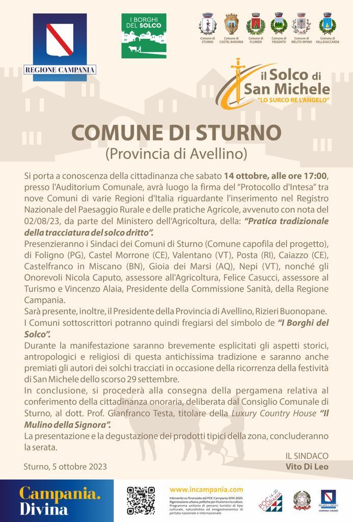Come da programma, il convegno sulla “Tracciatura del solco dritto” si é svolto a Sturno, questa sera, alla presenza di 9 sindaci che hanno firmato il protocollo d’intesa per fregiarsi del titolo di “Borghi del Solco”, con due assessori regionali. Il tutto presentato magistralmente sa Rino Genovese. La pratica è una pratica religiosa che si perde nella notte dei tempi, legata al culto di San Michele, e sicuramente legata anche a pratiche più arcaiche e pagane. Ancora una volta l’irpinia cerca la sua chiave di riscatto attraverso il rilancio delle eccellenze del passato. Ad maiora!