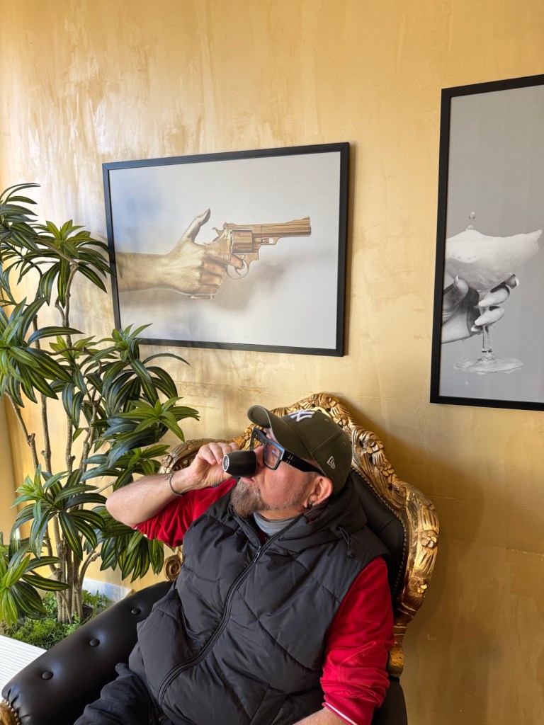 Bevo un caffè come se fosse un atto di resistenza. Sul muro, una pistola dorata e un brindisi sospeso.